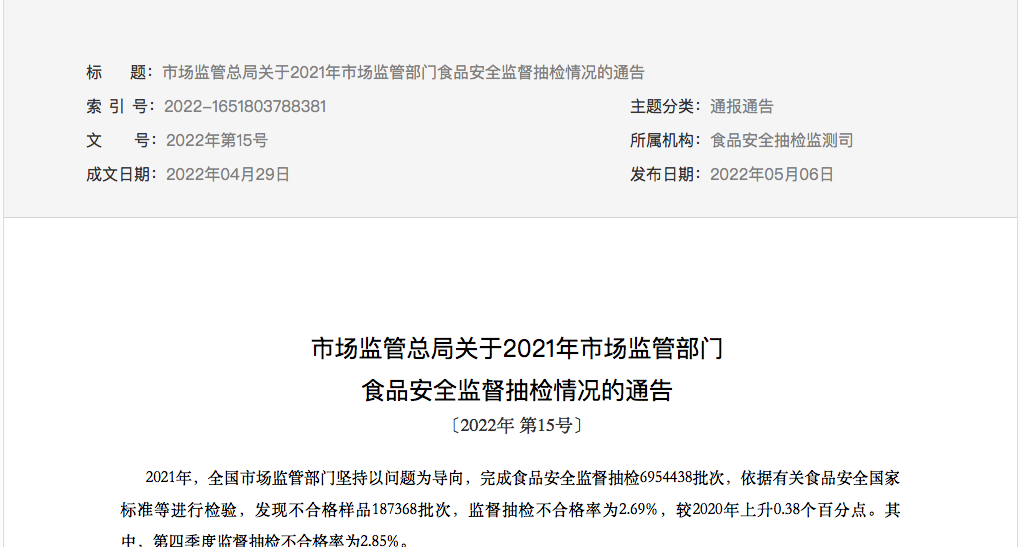 近日,国家市场监督管理总局发布2021年市场监管部门食品安全监督抽检情况的通告。