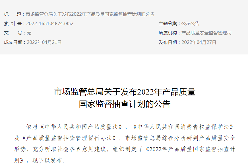 近日,国家市场监督管理总局发布2022年产品质量国家监督抽查计划。