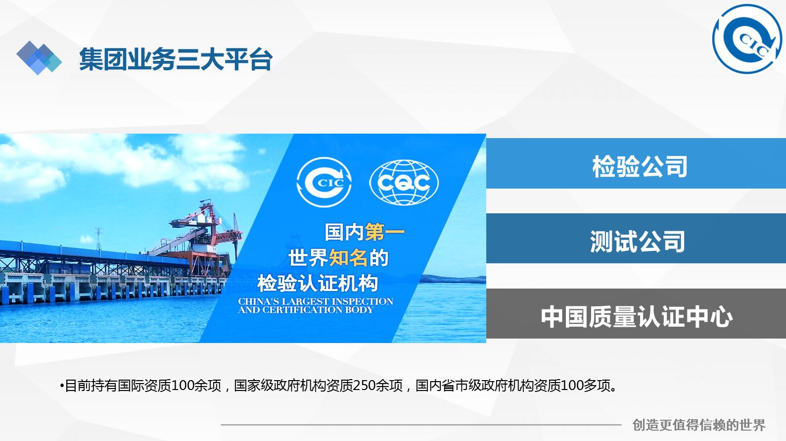 经过40年的发展,中国中检已经成为“中国第一,世界知名”的国际化检验检测认证企业集团。中国中检拥有CCIC和CQC两大品牌,设有检验公司、中国质量认证中心(CQC)、测试公司三大业务平台,国内机构网络完备,在30多个国家(地区)的主要口岸和货物集散地设有机构,近2万名员工和数百家实验室,为10万余家国内外客户提供“一揽子”解决方案和“一站式”“本地化”综合质量服务。